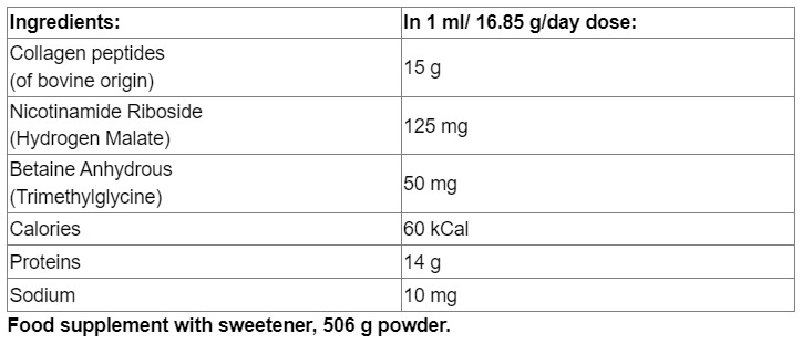 Съставки: Колагенови пептиди, Никотинамид рибозид, Бетаин