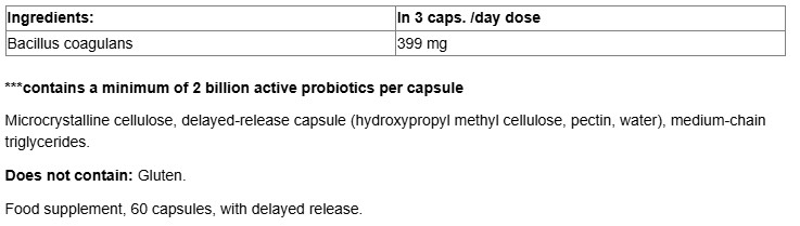 Bacillus coagulans е полезна пробиотична бактерия, която образува спори, устояващи на стомашната киселина и жлъчните соли. В червата тя се активира, произвежда млечна киселина и стимулира растежа на полезни микроорганизми, което подпомага храносмилането, намалява възпалението и засилва естествените имунни бариери.