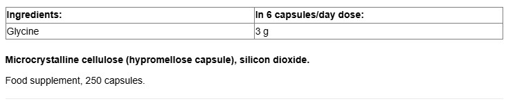 Глицин е проста аминокиселина, необходима за изграждането на протеини като колаген, която подпомага регенерацията на мускулните влакна и релаксира нервните клетки. Той допринася за по-добро заспиване, намалява усещането за умора и подкрепя общото усещане за спокойствие.
