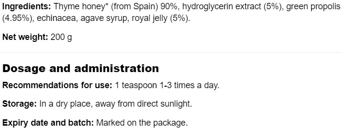 Honey from Thyme, Green Propolis and Royal Jelly / 200 g