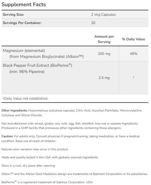 Съставки: Магнезий (от магнезиев бисглицинат Albion™), екстракт от плод на черен пипер (BioPerine®)