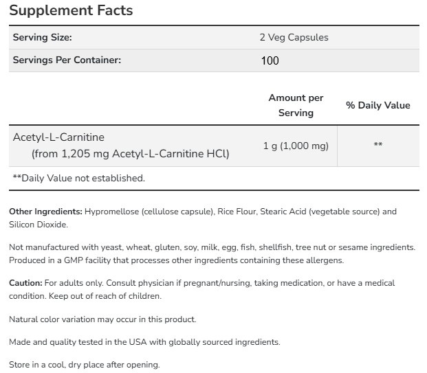 Съставки: Acetyl-L-Carnitine (от 1205 mg Acetyl-L-Carnitine HCl).