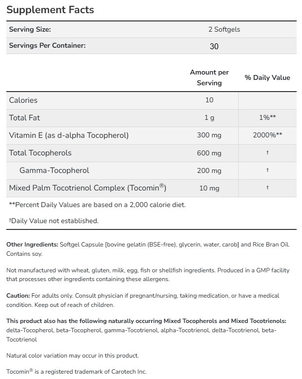Съставки: Витамин Е (d-алфа токоферол), гама-токоферол, смесен палмов токотриенолов комплекс (Tocomin®).
