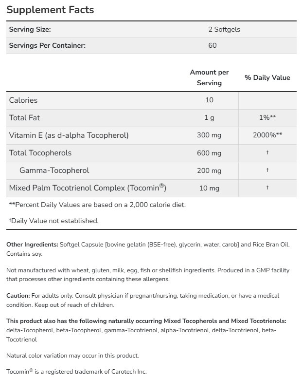 Съставки: Витамин Е (d-алфа токоферол), гама-токоферол, смесен палмов токотриенолов комплекс (Tocomin®).