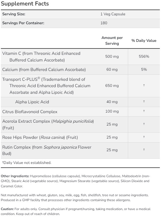 Съставки: Витамин C (буфериран калциев аскорбат), алфа-липоева киселина, цитрусови биофлавоноиди, екстракт от ацерола, шипков прах, рутин.