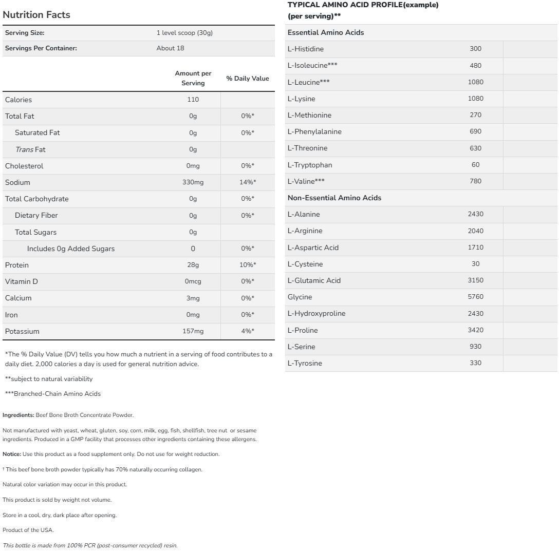 Съставки: Телешки протеин (Bone Broth), съдържащ аминокиселинен профил с незаменими и заменими аминокиселини.