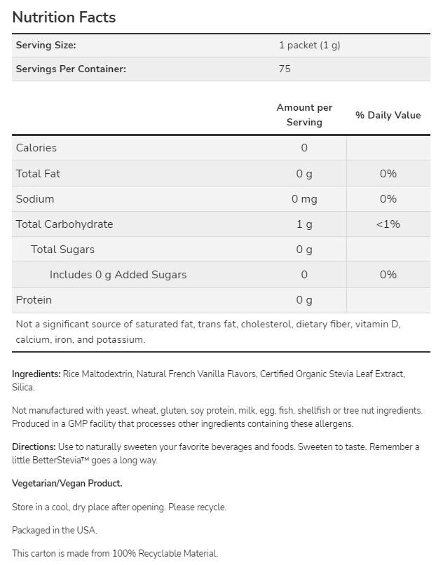Better Stevia Packets е чудесен избор за хора, които търсят здравословен заместител на захарта. В състава ѝ влизат органичен екстракт от стевия и натурални френски ванилови аромати, които придават мек и приятен вкус. Лесно се добавя към кафе, чай, смутита или десерти. Пакетчетата са удобни за употреба у дома, в офиса или при пътуване.