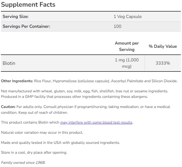 Съставки: Биотин (1000 mcg), оризово брашно, хипромелоза (растителна капсула), аскорбил палмитат и силициев диоксид