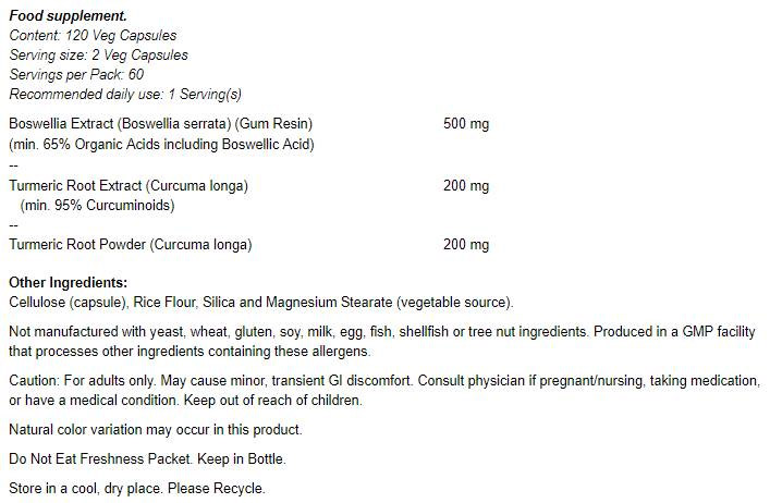Съставки: Екстракт от босвелия (Boswellia serrata), екстракт от куркума (Curcuma longa), куркума на прах (Curcuma longa).