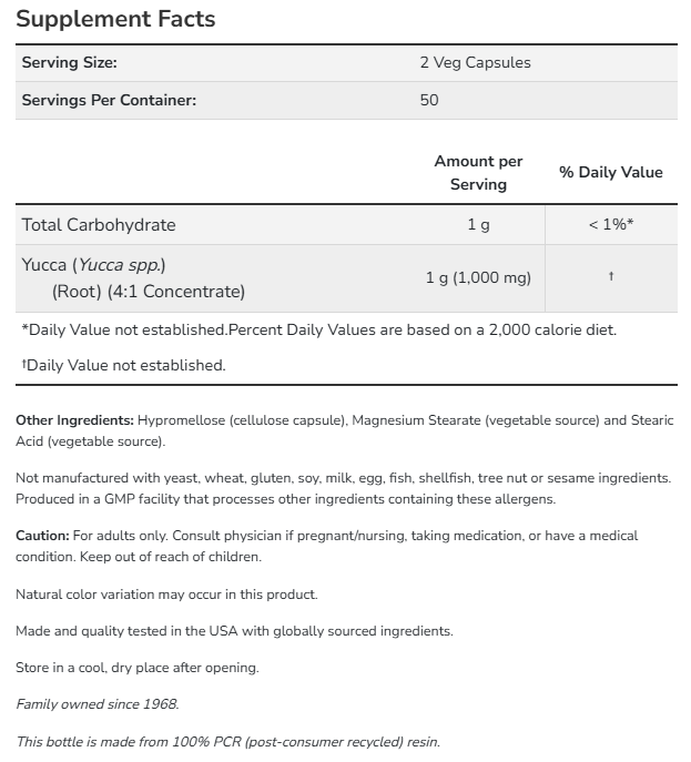 Yucca 500 mg от NOW съдържа стандартизиран екстракт от корен на юка, който се използва в традиционните практики като помощ при подуване, газове и обща храносмилателна тежест. Юката е богата на сапонини – вещества, които подпомагат разграждането на токсини и могат да окажат благоприятно въздействие върху комфорта в ставите. Продуктът е без глутен, млечни, соя и други често срещани алергени.