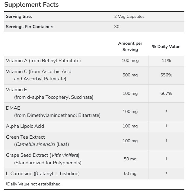 Съставки: Витамин А, витамин С, витамин Е, DMAE, алфа-липоева киселина, екстракт от зелен чай, екстракт от гроздово семе, L-карнозин