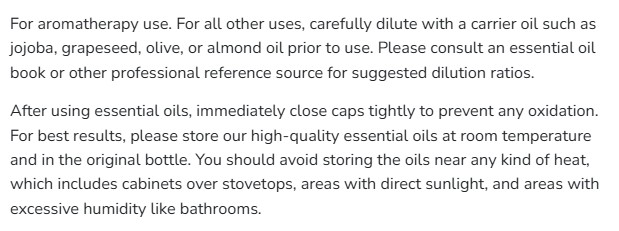 Начин на приемане: За ароматерапия – използвайте самостоятелно или в комбинация. За други приложения разредете с базово масло (жожоба, гроздови семки, зехтин и др.).