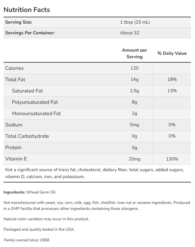 Wheat Germ Oil Liquid от NOW съдържа чисто масло от пшеничен зародиш, което осигурява витамин Е и полиненаситени мазнини. Витамин E помага за защитата на клетките от оксидативен стрес, а ненаситените мазнини подпомагат нормалната функция на сърцето и кожата. Продуктът не съдържа трансмазнини, холестерол или добавени захари, което го прави подходящ за всекидневно ползване.