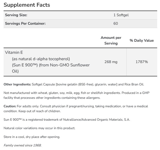Съставки: Витамин E (като естествен d-алфа токоферол), слънчогледово масло (Sun E 900™)