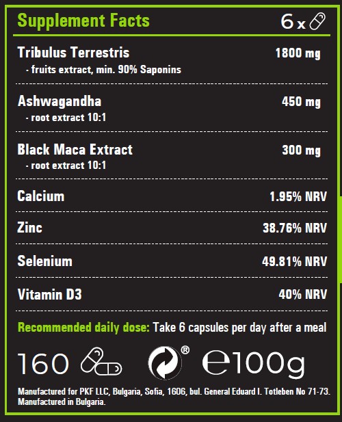 Съставки:Tribulus Terrestris, Ashwagandha, Black Maca Extract, калций, цинк, селен, витамин D3