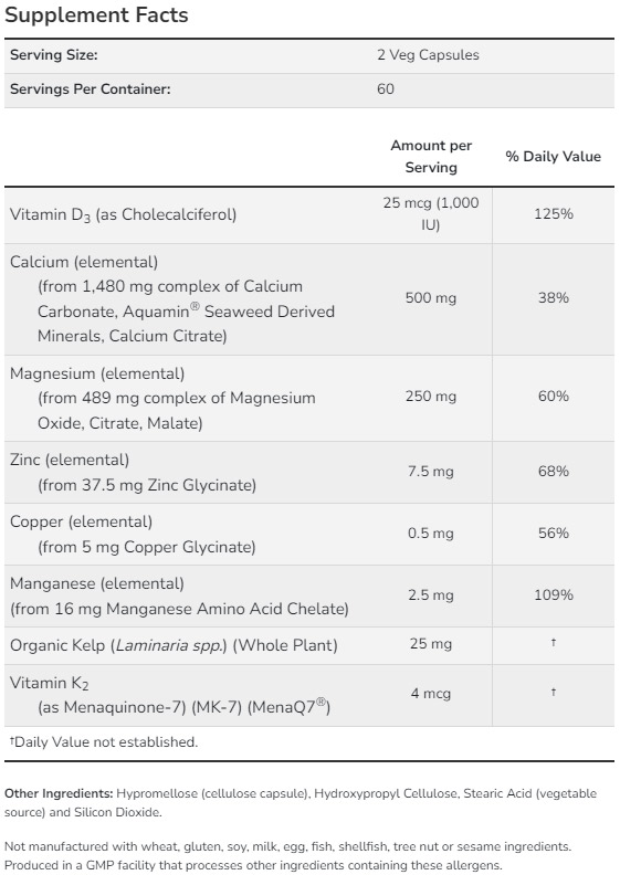 Формулата съчетава Калций, който е основен за здрави кости и зъби, и Магнезий, който подпомага мускулната функция и релаксацията. Витамин D3 подобрява усвояването на калция, а Цинк, Манган и Мед допринасят за метаболизма на минералите и защитата на клетките. Добавеният Йод от келп подпомага щитовидната жлеза и общия хормонален баланс.