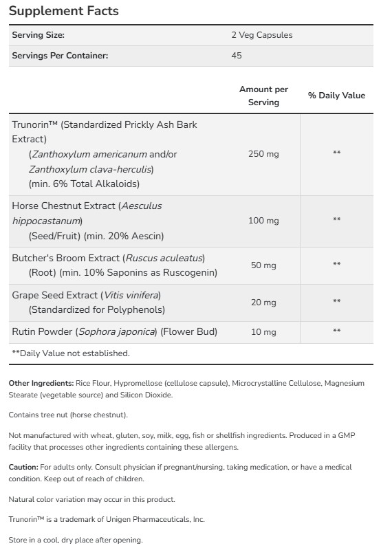 Съставки: Trunorin™, екстракт от конски кестен, бодлив залист, екстракт от гроздово семе, рутин
