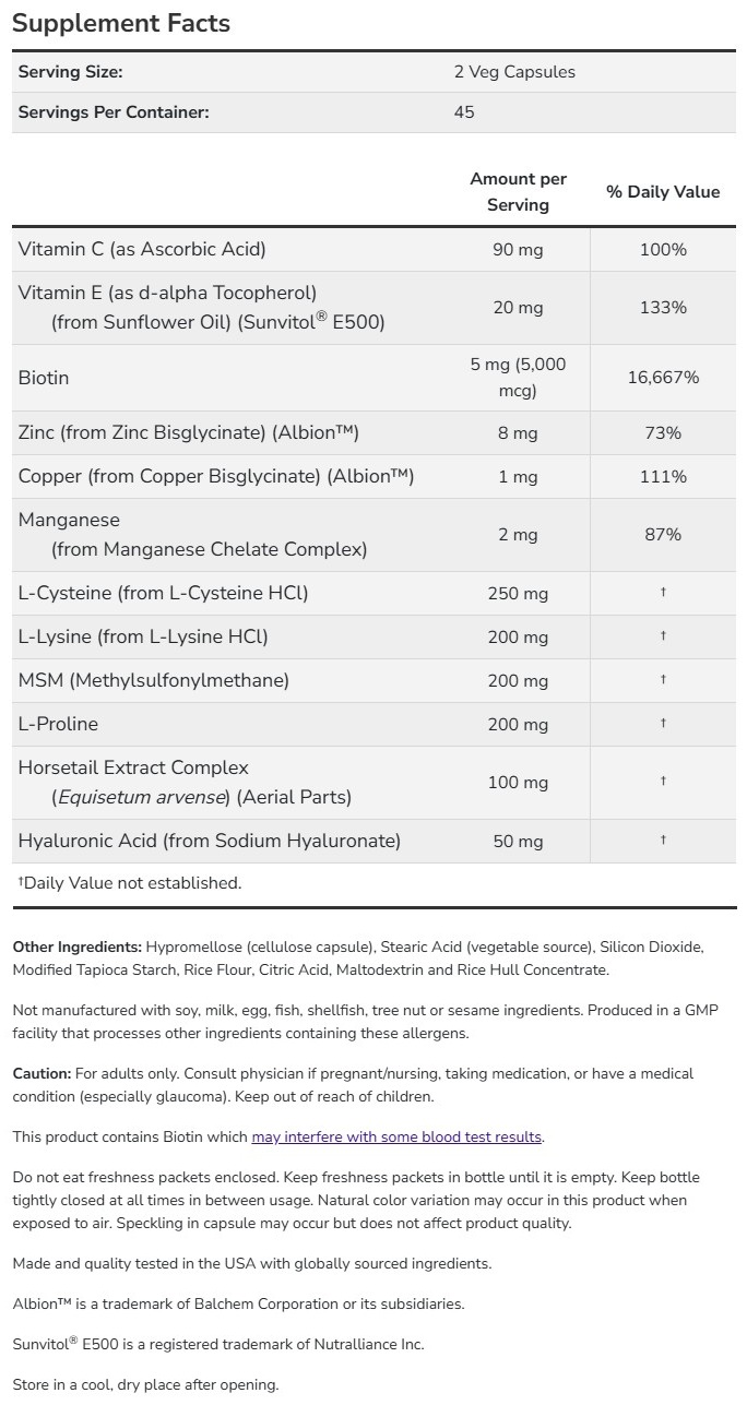 Формулата комбинира ключови съставки, които работят заедно за здравето на косата, кожата и ноктите. Биотинът играе важна роля за здравия растеж на косата и ноктите. Витамин C подпомага образуването на колаген, което е от съществено значение за еластичността и добрия вид на кожата. Хиалуроновата киселина спомага за поддържане на хидратацията на кожата и ставите. Цинкът, медта и манганът действат като мощни антиоксиданти, които предпазват клетките от оксидативен стрес. Добавените аминокиселини като L-цистеин, L-лизин, L-пролин, заедно с MSM и екстракт от хвощ, осигуряват структурна подкрепа за здрави тъкани и поддържане на добър външен вид.