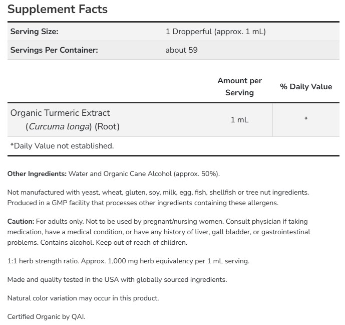 Продуктът съдържа чист екстракт от куркума (Curcuma longa) с концентрация 1:1 – това означава, че 1 мл отговаря на 1000 мг изсушена билка. Куркумата е известна със своите мощни антиоксидантни свойства и подкрепа за опорно-двигателната система. Подпомага поддържането на подвижността и нормалното състояние на ставите, като същевременно се грижи за здравето на храносмилателния тракт и черния дроб. Течната форма осигурява по-бързо действие и лесно дозиране. Продуктът е органичен и не съдържа глутен, млечни продукти, соя или изкуствени добавки.