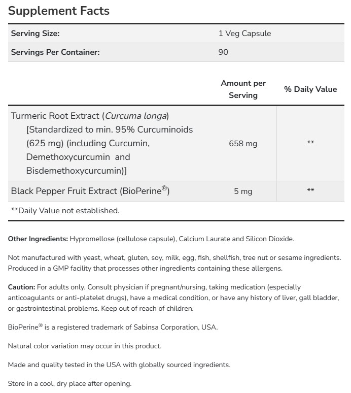 Съставки: Екстракт от куркума (Curcuma longa) стандартизиран до 95% куркуминоиди, екстракт от черен пипер (BioPerine)