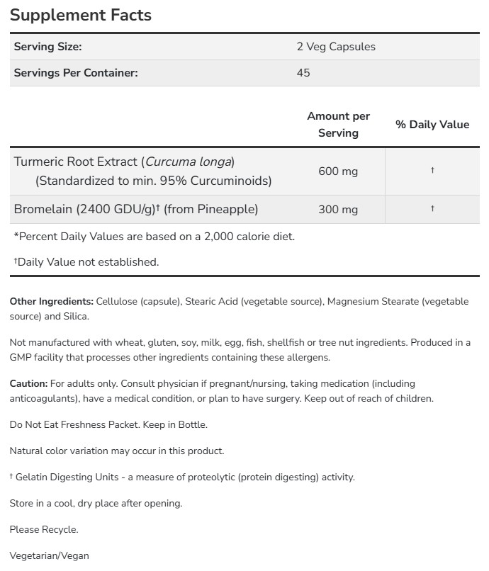 Съставки: Екстракт от куркума (Curcuma longa), бромелаин (от ананас)