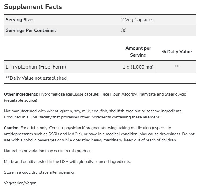 Съставки: L-триптофан (в свободна форма), растителна капсула, оризово брашно, стеаринова киселина, аскорбил палмитат