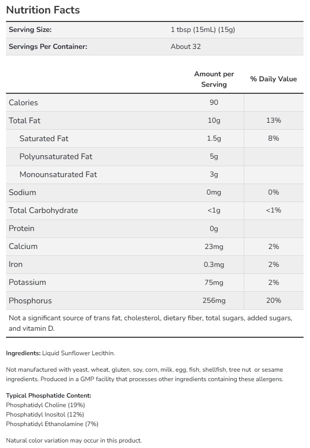 Слънчогледовият лецитин е естествен източник на фосфатидилхолин, фосфатидилинозитол и фосфатидилетаноламин, които са ключови за структурата и функцията на клетките. Подпомага нормалния метаболизъм на мазнините, насърчава прочистването на черния дроб и благоприятства нервната система. Течната форма го прави удобен за добавяне към смутита или ястия.