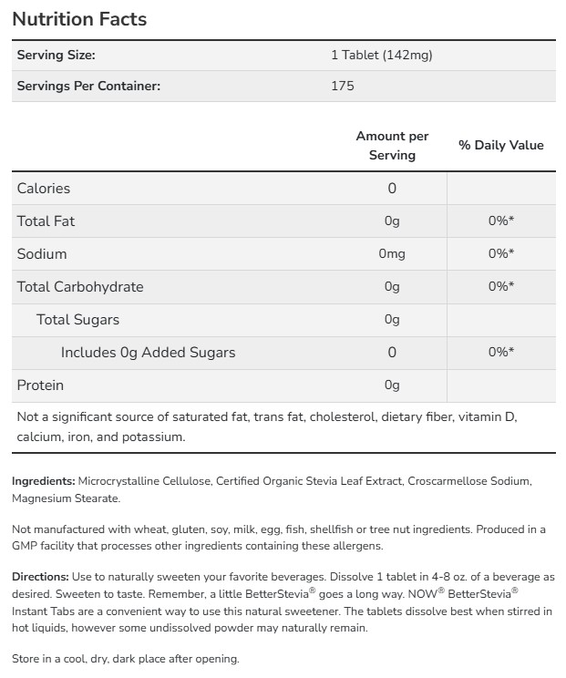 BetterStevia Instant Tabs съдържа органичен екстракт от стевия, който осигурява сладък вкус без горчивина. Таблетките се разтварят бързо в течности, което ги прави идеални за кафе, чай или други напитки. Лесни са за дозиране, като всяка таблетка може да подслади чаша от 120-240 мл течност.