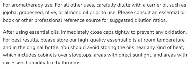 Начин на приемане: само външно – разреден с базово масло за масаж или добавен в дифузер за ароматизиране на помещения