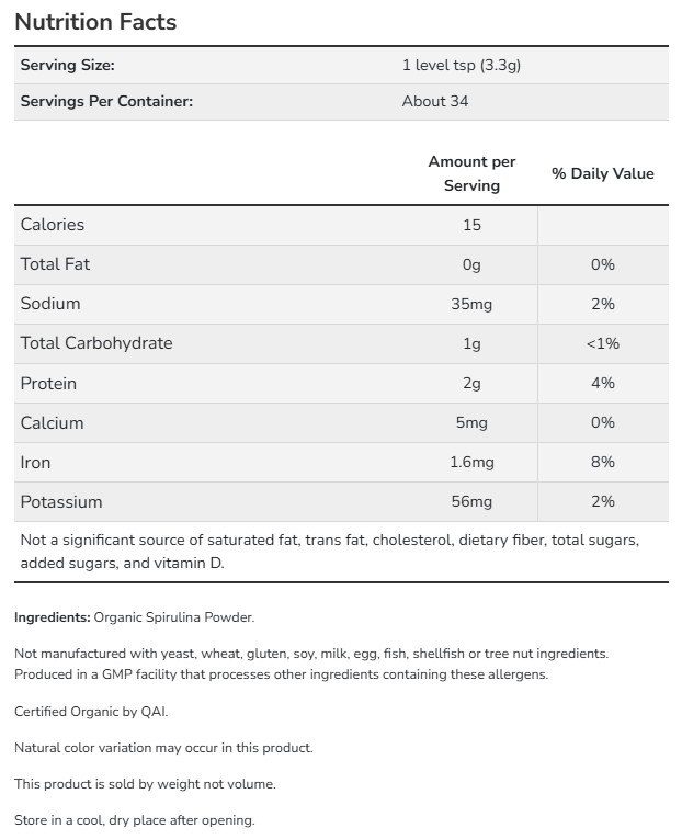 Съставки: Органичен прах от спирулина (Arthrospira platensis)