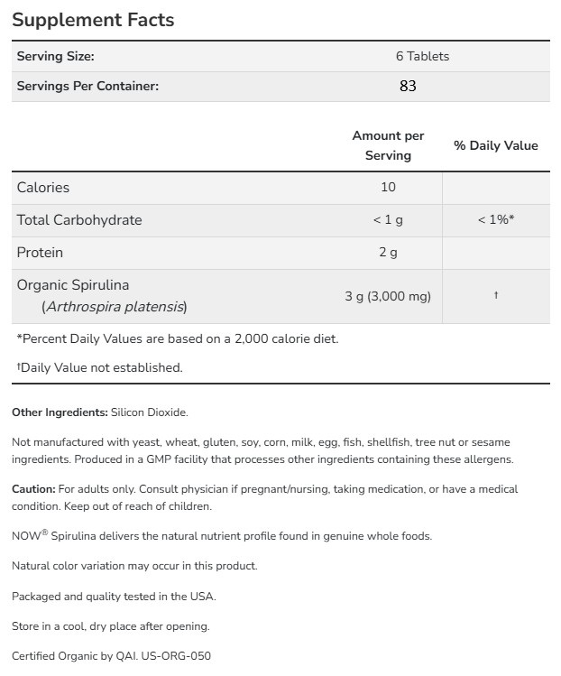 Spirulina 500 mg, Organic от NOW е натурална формула с органична спирулина под формата на лесни за прием таблетки. Продуктът е сертифициран от QAI като органичен и не съдържа глутен, алергени или добавки. Подходящ е за всекидневна употреба за подкрепа на енергията, имунната система и антиоксидантната защита.