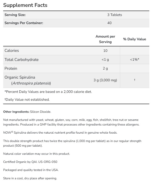 Spirulina Double Strength 1000 mg от NOW предлага силно концентрирана доза от органична спирулина – суперхрана, която осигурява пълноценен растителен протеин, естествени антиоксиданти и ключови нутриенти в удобно количество само с 3 таблетки дневно. Това е двойно по-силна формула спрямо стандартната 500 mg таблетка.