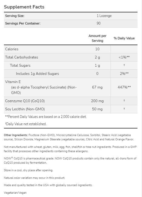 CoQ10 200 mg от NOW е висококачествен коензим Q10 под формата на таблетки за смучене, които подпомагат енергийното производство в клетките и здравето на сърцето. Формулата е обогатена с витамин Е и соев лецитин, които подобряват усвояването и антиоксидантната защита.