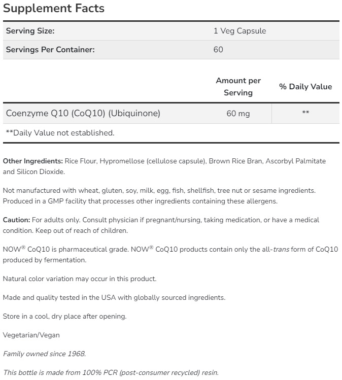 CoQ10 60 mg от NOW е хранителна добавка, която подпомага сърдечното здраве, клетъчния метаболизъм и енергийните нива. Съдържа фармацевтичен клас коензим Q10, произведен чрез ферментация за максимална чистота и ефективност.