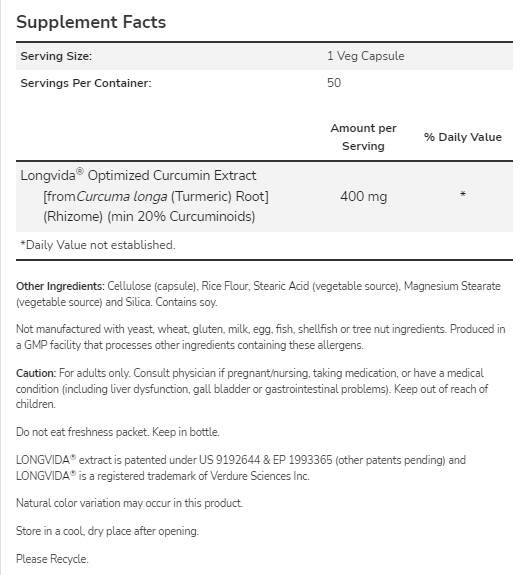 Longvida® куркуминът е специално разработен за по-добро усвояване и задържане в организма, като подпомага мозъчната функция и защитава нервните клетки от оксидативен стрес. Куркуминът е добре известен със своите противовъзпалителни и антиоксидантни свойства, които допринасят за намаляване на възпалителните процеси в организма и подпомагат здравето на ставите и имунната система.