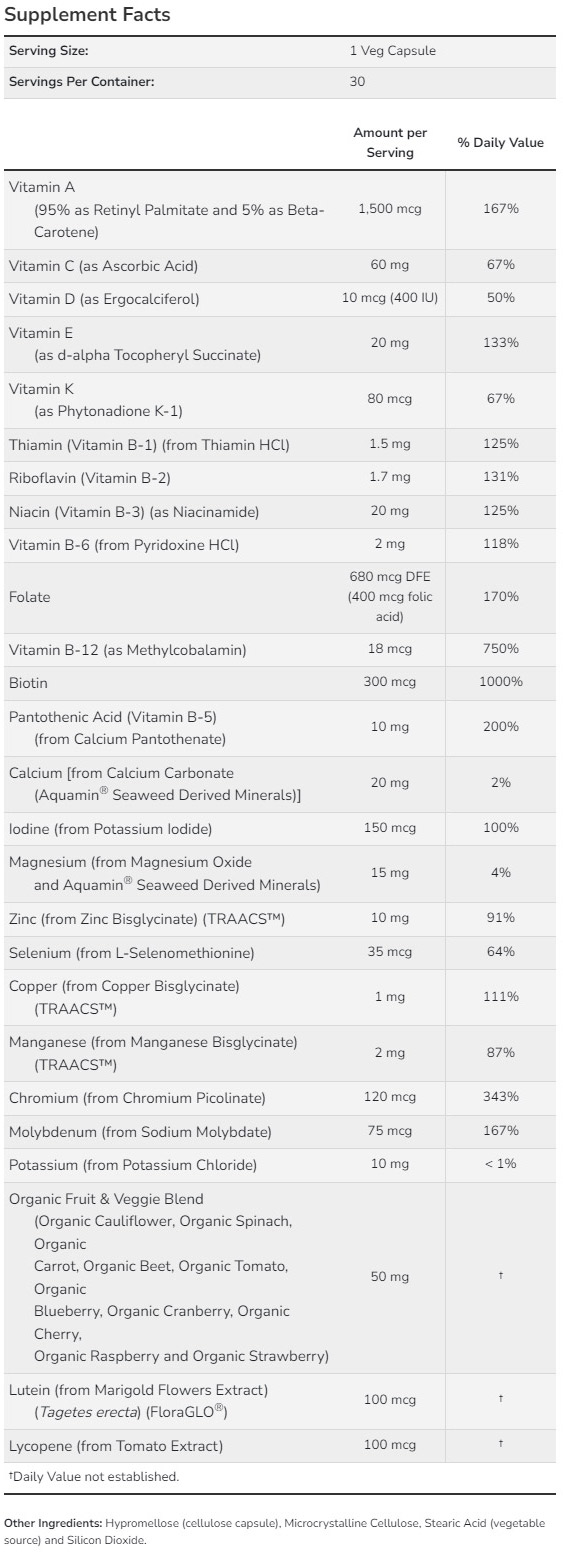 Комплексът от витамини и минерали в Daily Vits включва витамини А, C, D, E, K и B-комплекс, които подпомагат различни функции на организма, включително имунната защита, енергийния метаболизъм и здравето на кожата. Минералите като магнезий, цинк, йод и хром играят важна роля в поддържането на мускулната функция, хормоналния баланс и антиоксидантната защита. Органичната плодово-зеленчукова смес осигурява допълнителни антиоксиданти, които подпомагат общото благосъстояние.