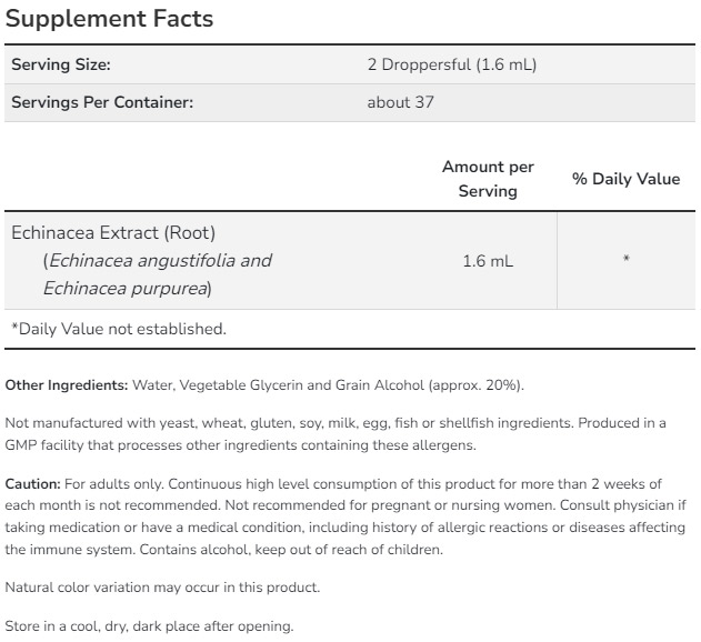 Echinacea Liquid Extract комбинира две форми на ехинацея – Echinacea angustifolia и Echinacea purpurea, които работят заедно, за да подпомогнат естествените защитни механизми на организма. Ехинацеята стимулира производството на бели кръвни клетки и подпомага имунния отговор срещу патогени. Освен това има антиоксидантни свойства, които допринасят за цялостното здраве и защита на клетките от оксидативен стрес.