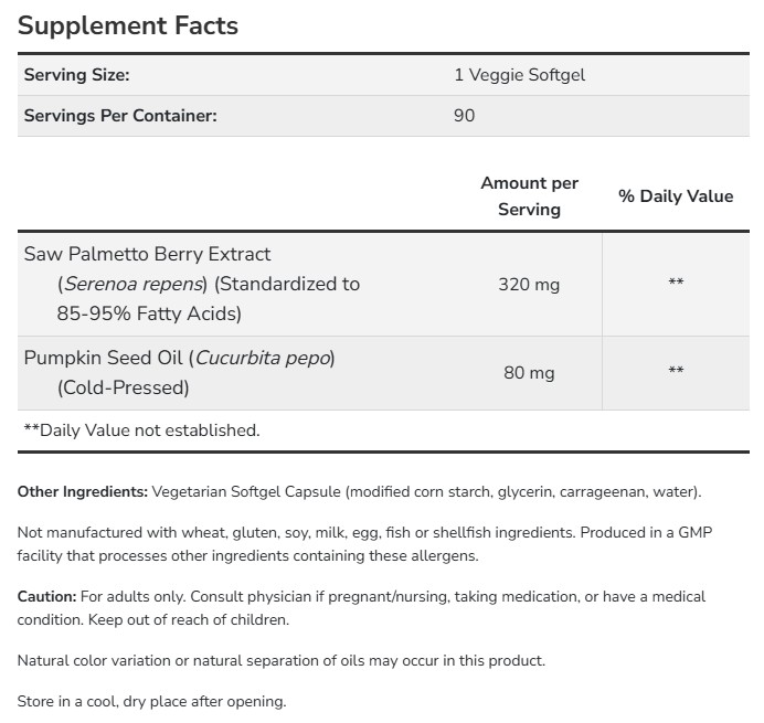 Saw Palmetto Extract 320 mg with Pumpkin Seed Oil от NOW е силно концентрирана формула, създадена за поддържане на нормалната функция на простатата и уринарния комфорт при мъже. Комбинира стандартизиран екстракт от сао палмето с масло от тиквени семки – две съставки с дългогодишна традиция в мъжката грижа.