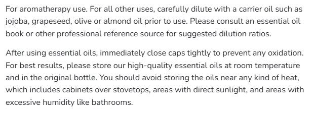 За външна употреба: Разредете с базово масло (напр. жожоба, бадемово, гроздови семки) преди нанасяне върху кожата