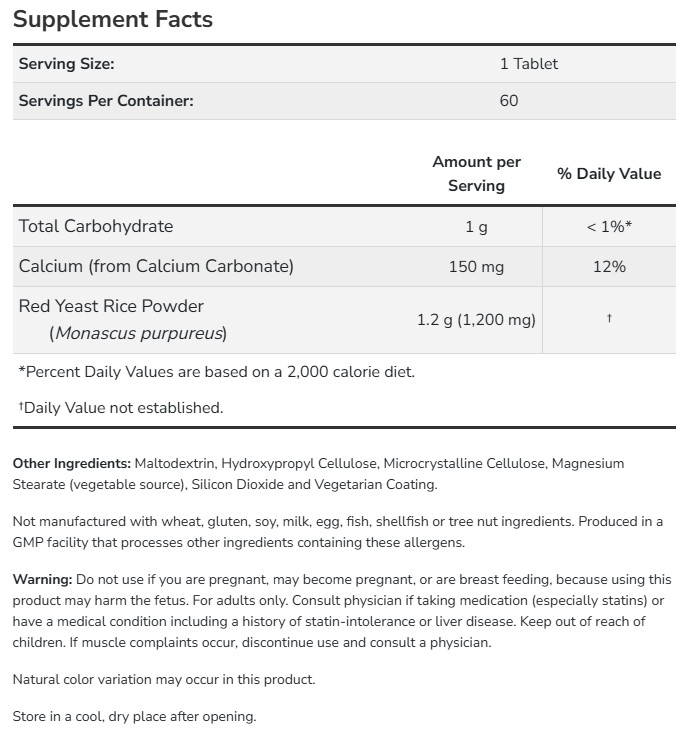 Съставки: Прах от червен оризов фермент (Monascus purpureus), калций (от калциев карбонат)