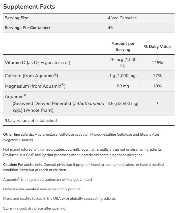 Продуктът съдържа Aquamin®, богат на естествен калций, магнезий и над 70 микроелемента, извлечени от червени водорасли от вида Lithothamnion spp. Тази форма на калций се отличава с отлична бионаличност и щадящ ефект върху храносмилателната система. Добавеният витамин D2 подобрява усвояването на калция и допълнително подпомага имунната и мускулната функция. Формулата е подходяща както за активно спортуващи, така и за жени в менопауза, възрастни хора и вегетарианци.