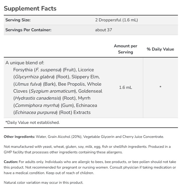 Съставки: Прополис, ехинацея, златен корен, сладник, карамфил, смирна, бряст, форзиция, черешов концентрат, глицерин, алкохол (20%)