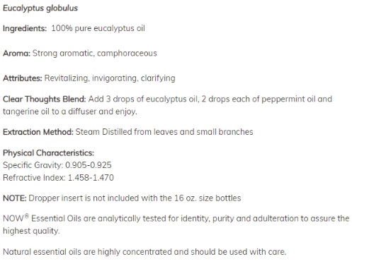 100% Pure Eucalyptus Oil от NOW е висококачествено, чисто етерично масло, добито чрез парна дестилация от листата и малките клонки на Eucalyptus globulus. Отличава се със силен, камфоров аромат и има ободряващо и освежаващо действие.
