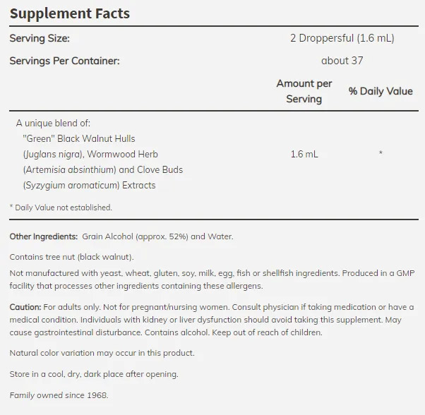 Съставки: Екстракти от черен орех, пелин и карамфилови пъпки.