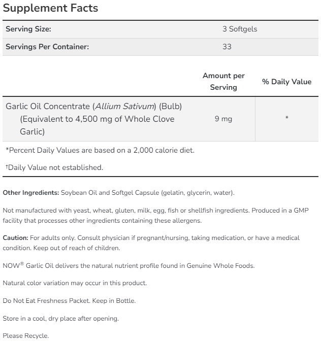 Благодарение на естествените си съставки, чесънът подпомага сърдечно-съдовата система, като благоприятства кръвообращението и баланса на холестерола. Формулата на NOW е създадена така, че да не предизвиква неприятен дъх, което я прави удобна за ежедневен прием.
