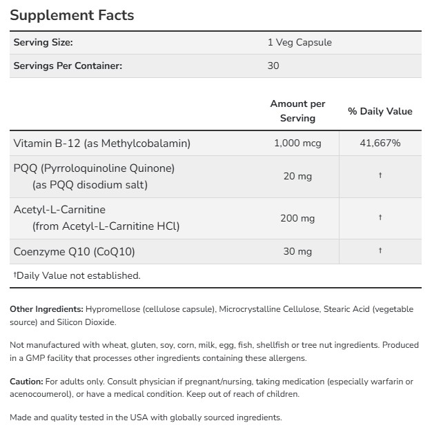Съставки: PQQ, витамин B12 (метилкобаламин), ацетил-L-карнитин, коензим Q10