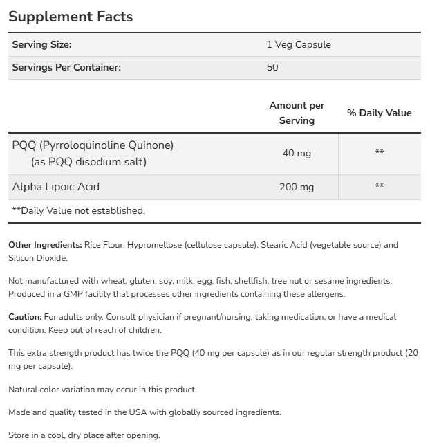 PQQ Extra Strength от NOW съдържа 40 mg пиролохинолин хинон (PQQ) – съединение, което участва в създаването и поддържането на митохондрии – енергийните централи на клетките. Добавената алфа-липоева киселина (200 mg) действа като мощен антиоксидант, който неутрализира свободните радикали и подпомага възстановяването на други антиоксиданти като витамин C и E. Формулата е особено подходяща за хора с висока умствена активност или за онези, които търсят клетъчна защита и поддържане на енергията.