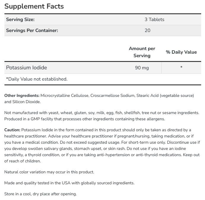 Potassium Iodide от NOW съдържа 90 mg калиев йодид в доза от 3 таблетки. Калиевият йодид е форма на йод, която се използва най-често при специални ситуации, изискващи бързо насищане на организма с йод – например при йоден дефицит, специфични медицински препоръки или при радиационна защита. Продуктът е предназначен само за краткосрочна употреба и под наблюдение от лекар.