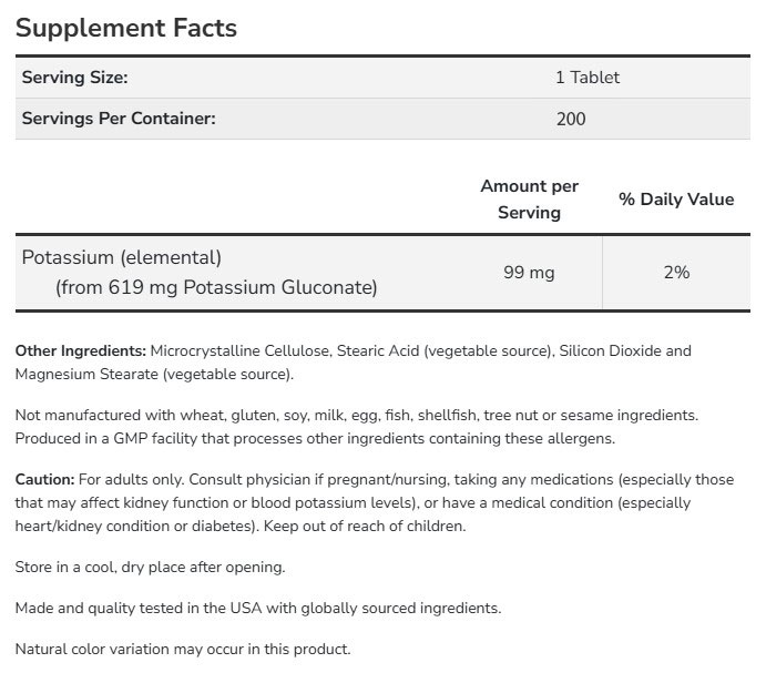 Potassium Gluconate 99 mg от NOW е хранителна добавка с калий в удобна таблетна форма, предназначена за поддържане на нормалната функция на сърцето, мускулите и нервната система.