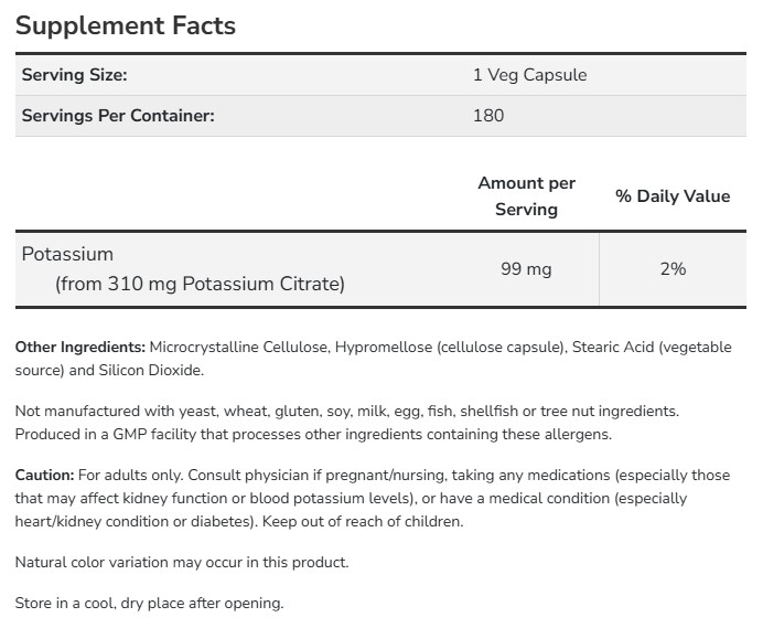 Potassium Citrate от NOW осигурява калий във форма на калиев цитрат, който е лесен за усвояване от организма. Калият е важен минерал и електролит, който участва в много физиологични процеси – от контрол на мускулната контракция и сърдечния ритъм до регулиране на течностите и кръвното налягане.